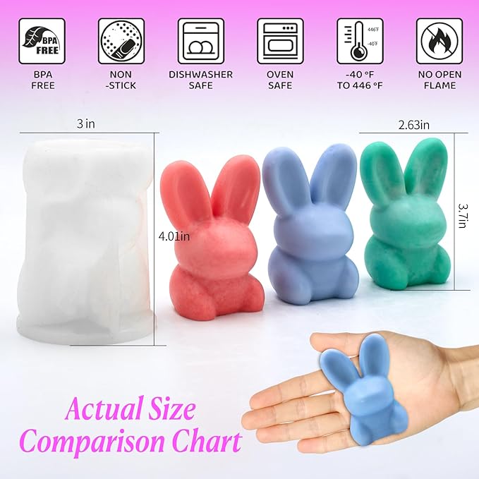 - 【Lovely Shapes】With Easter just around the corner, are you missing a touch of holiday cheer in your home?.This 3D easter bunny candle mold is suitable for all easter themed DIY scenes. Whether you're making holiday candles, decorating cakes, or creating other handicrafts, it's an ideal choice.