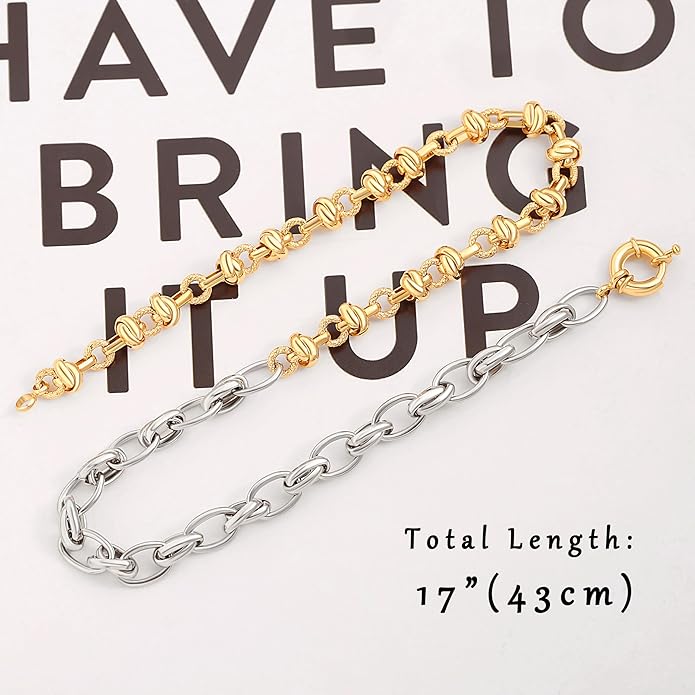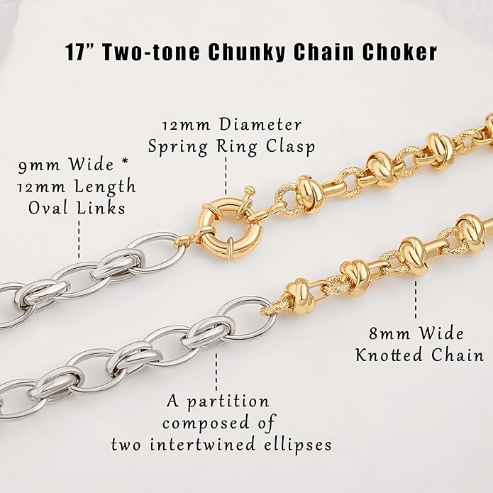 - Chunky Chain Necklace Design: The length of the two-tone necklace is 17". 18k gold-plated knotted chain necklace and platinum-plated silver oval link choker, will not easily tarnish and very shiny for a long time, which makes it stand out among all other plain open chain necklaces. The sailor clasp makes the simple short necklace easy to put on or take off