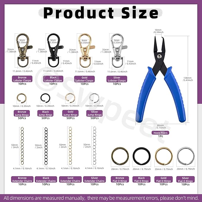 - 🎯 Complete Keychain Making Set ------ The set contains almost everything you need to create unique keychains. Includes 40 swivel lanyard snap hooks, 40 keychain rings, 40 extender chains, and 200 jump ring. Each item comes in 4 colors: bronze, black, gold, silver. Also,along with 1Pc split ring pliers. Items are placed in a case with labels for convenient carrying and using.