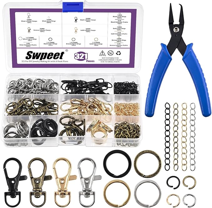 Swpeet 321Pcs Assorted Keychain Making Set with Pliers, 40Pcs Swivel Lanyard Snap Hook, 1Pc Split Ring Pliers, 40Pcs Keychain Ring, 40Pcs Extender Chains, 200Pcs Jump Rings, Bronze/Black/Gold/Silver