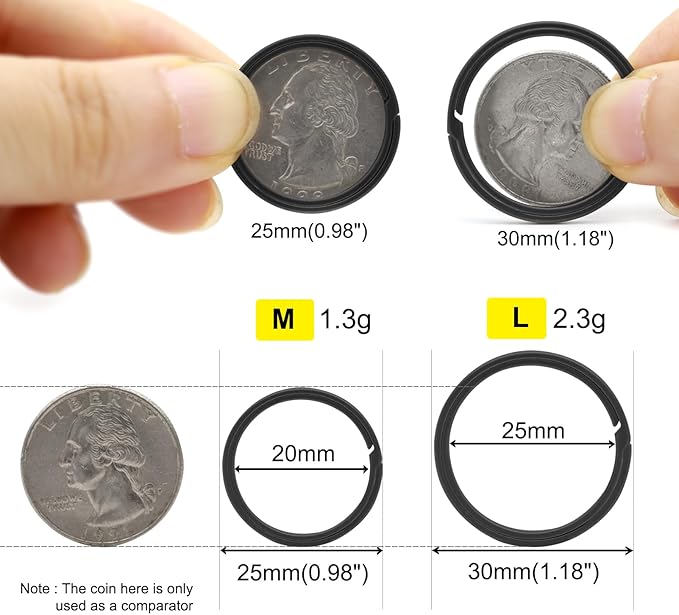 - PremiumTitanium Key Rings: Size M is 0.98" and L is 1.18". Size L is recommended for thick car keys. All the keychain rings are made of titanium alloy and are super lightweight while being super strong. They are also widely used for DIY projects and craft and more