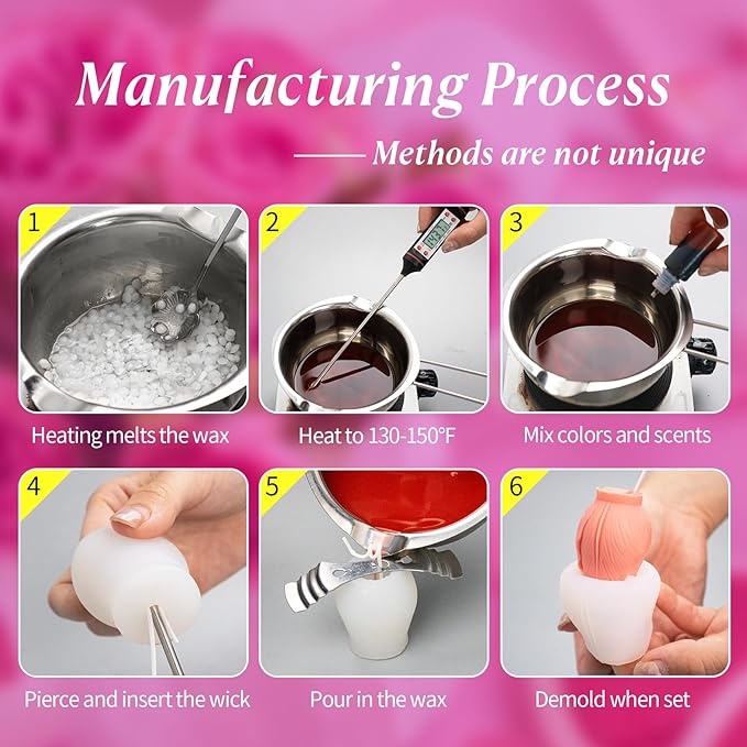- 【Easy to Use】Fix the wick firmly, melt the wax material and add fragrance and pigment as needed. Pour the wax liquid into the mold when it reaches the appropriate temperature. After it cools and solidifies, demold it, and then trim the wick and the edges of the candle.