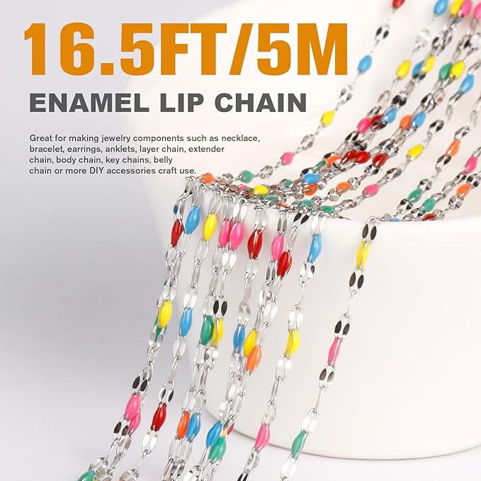 16.5FT Colorful Enamel Chain Roll, 2MM Rainbow Stainless Steel Enalem Lip Link Chains Spool Bulk for DIY Jewelry Making Necklace Bracelet