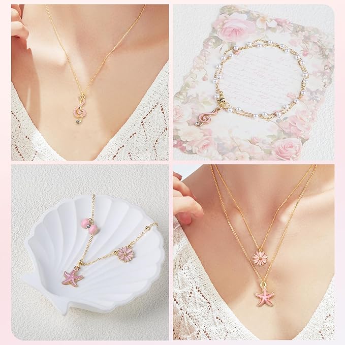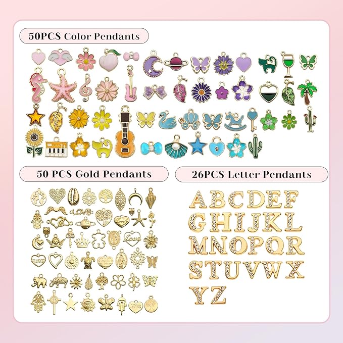 - Everything you need to start your jewelry journey: 5 styles of 18K gold-plated necklace chains for jewelry making, 100 jump rings, 20 lobster clasps, 50 gold pendants, 50 colorful pendants, 26 letter pendants, 10 pearl pendants, 2 precision pliers, and a convenient storage bag