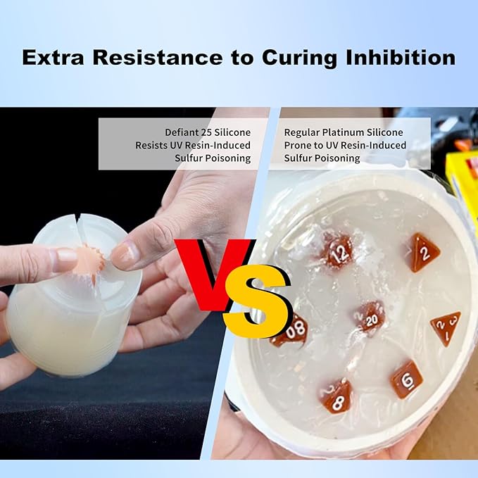 - Extra Resistance to Curing Inhibition - Defiant 25 can resist sulfur poisoning due to UV Resin much better than common platinum silicone. With just 30 minutes of curing the printed part submerged in water, Defiant 25 can cure without issues. No coating is needed. Defiant silicone clear mold works best with our Fast, Build, Blu, Easy, and Sculpt resins.