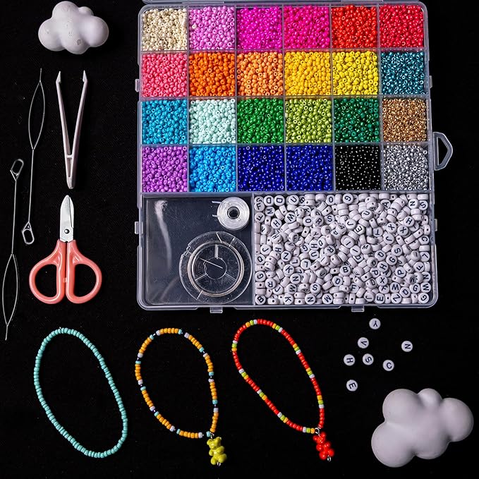 - 🎀 All-in-One Kit Includes 2400 seed beads (4mm), 2400 clay heishi beads (6mm), 480 pony beads (UV color changing and glow), 600 letter beads, and 500 assorted decorative beads—a massive assortment for endless creativity.