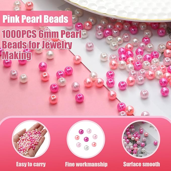 1000pcs Pearl Beads for Jewelry Making, 6mm Pink Series Plastic Beads for DIY Crafting Bracelets, Necklaces, Earrings