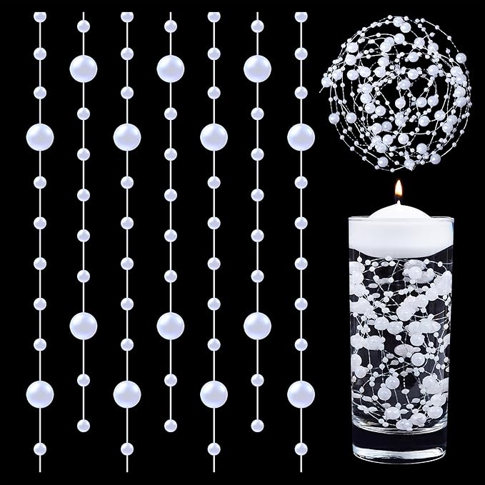 - Party Supplies: White floating pearls are for countless DIY projects and centerpiece table décor. Suitable as water beads for vases, or holiday centerpiece accents. Soft strings adjust to any vase height—add more pearl strings for tall vases to achieve a fuller look