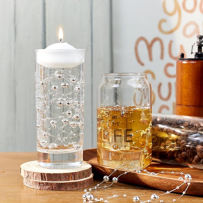 - Party Supplies: Silver floating pearls are for countless DIY projects and centerpiece table décor. Suitable as water beads for vases, or holiday centerpiece accents. Soft strings adjust to any vase height—add more pearl strings for tall vases to achieve a fuller look