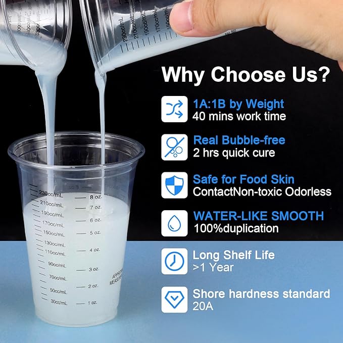 - 【Easy Mixing & Pouring】: This silicone molds making kit includes part A and part B with mix ratio 1:1 by weight; Pour the equal Part A and Part B together, then stir the silicone rubber for 3 minutes, very easy to use, no special skills or tools are needed; make sure to scrape the bottom and the sidewalls of the mixing cup to ensure thoroughly mixed.