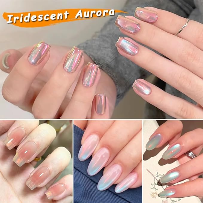 - 【Wide Application】The chrome nail powder can be applied on UV gel nails, acrylic nails, natural nails or false nail tips.In addition,you can apply various base gel to create various aurora iridescent nail designs.