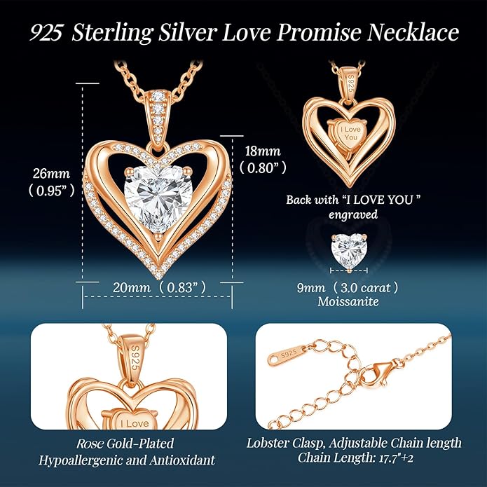 Moissanite Infinity Love Heart Pendant Necklaces for Women, 1-3 Carat 925 Sterling Silver 18K Gold Plated Engraved with"I LOVE YOU', Anniversary Birthday Present Jewelry Christmas Valentines Day Gift for Women Wife Girlfriend Her