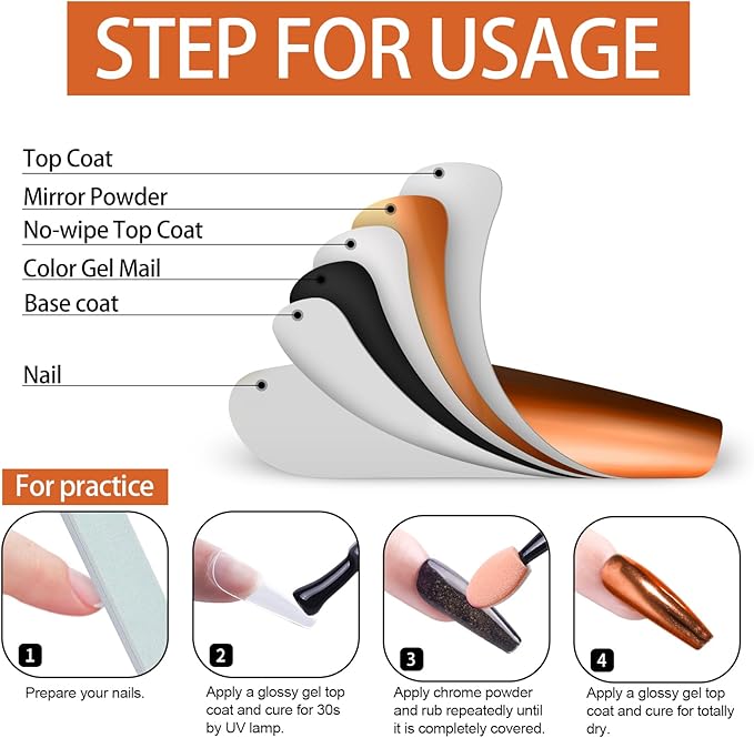- 【The Scope Of Application】All chrome powders should only be applied to glossy No wipe top coat to embellish Nail-Polishes color. Otherwise it is unusable, it can't be applied directly to the nail, and it can't be applied directly to the skin. Artdone chrome powder can be applied on UV gel nails, acrylic nails or false nail tips. You can use them very easily