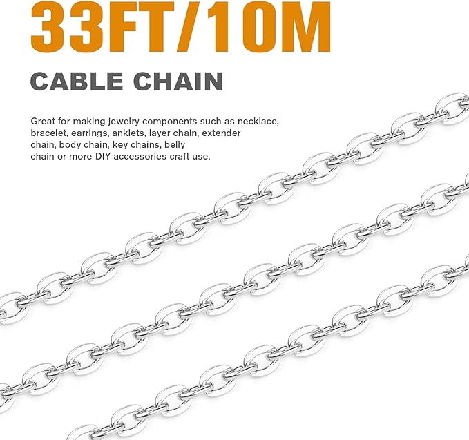- 【33 Feet Chains Bulk】Each pack include 33 Feet(10 Meters) silver plated cable chains with spool. The 33ft length allows you to make many items. When not in use, just need roll it back to the spool, easy and convenient.