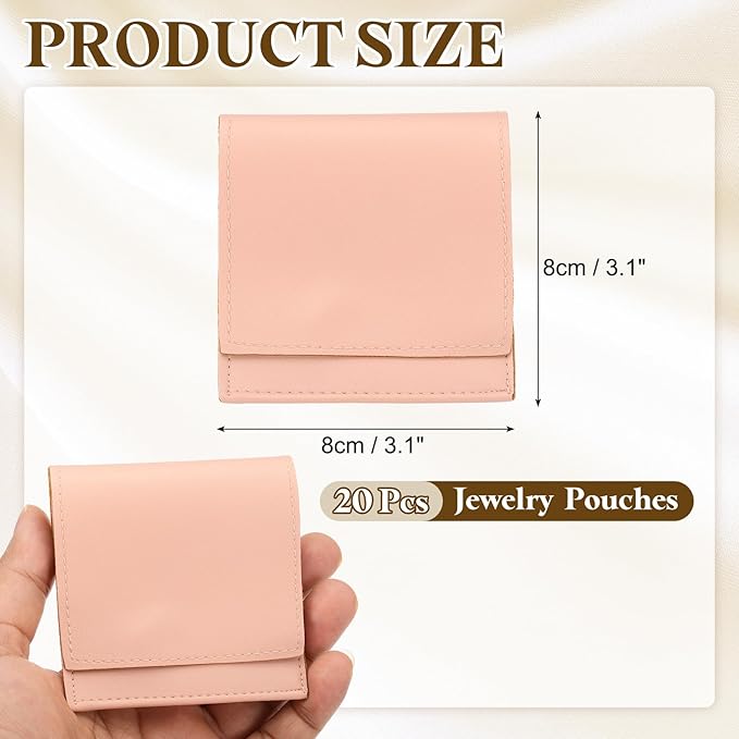 - Color: Light Pink; Total Size: 8 x 8 x cm/3.1 x 3.1 inches; Material: PU Leather; Quantity: 20PCS. These jewelry bags come in 11 colors. The appearance is simple and elegant, and the quantity is sufficient to meet your needs for storing jewelry and other small items, and you can also share it with friends.