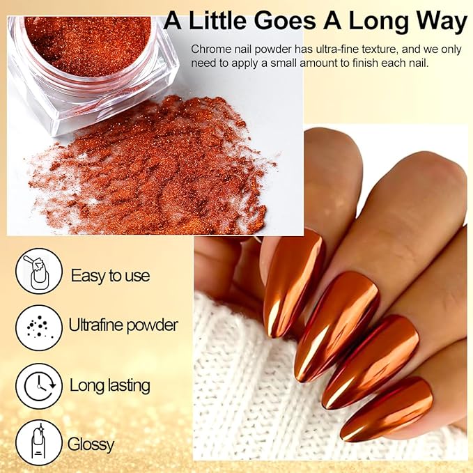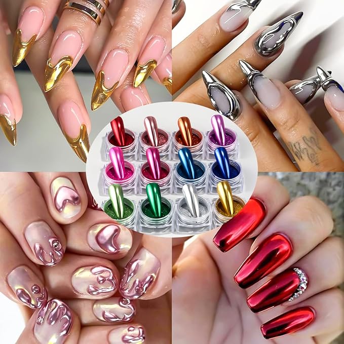 - 【Ultra-fine & Smooth Chrome Powder】Including 6pcs iridescent aurora powder and 12pcs metal mirror chrome powder. The texture of nail powder is ultra-fine, no graininess, and easy to seamlessly blend with nails, creating a smooth and flawless mirror effect. We only need to apply a small amount to finish each nail. A little goes a long way.