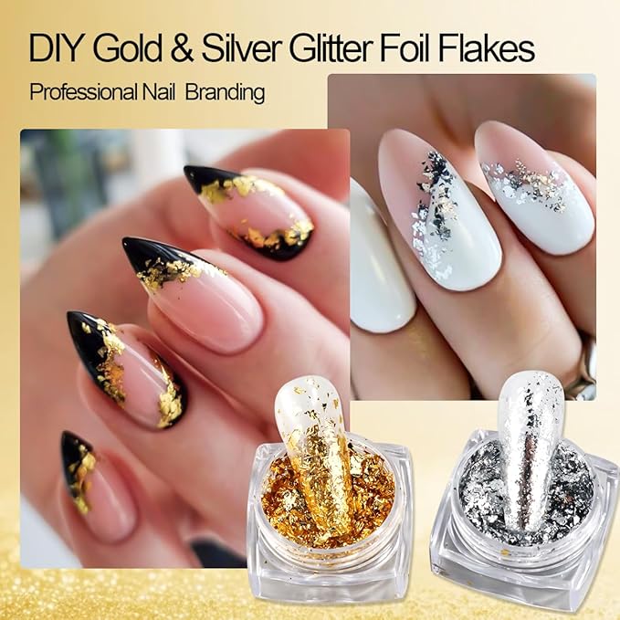 - 【Chunky Glitter Flakes】Not only includes chrome nail powder, but also gold & silver glitter flakes foils in the set. Perfect for nail art, whether for use at home or in a professional nail salon. You can also use it to decorate your cheeks, body, or DIY resin crafts.