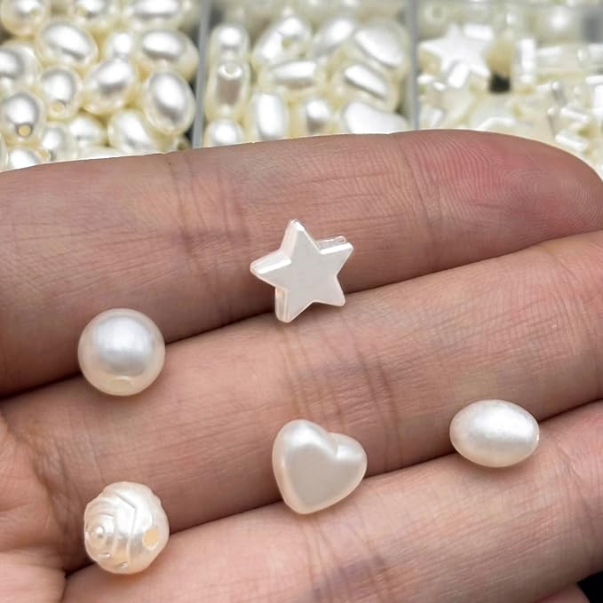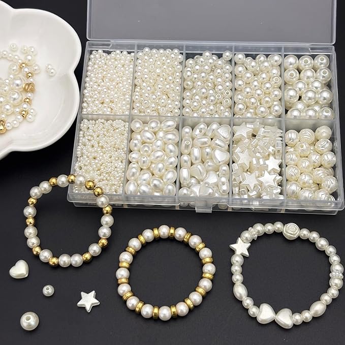 - PACKAGE INCLUDE: This pearl beads set includes a total of 1300 pieces, round beads including: 500pcs 3mm, 250pcs 4mm, 120pcs 5mm, 60pcs 6mm, 30pcs 8mm; and 170pcs flat spacer beads, 50pcs ellipses, 50pcs stars, 40pcs hearts, 30pcs roses.
