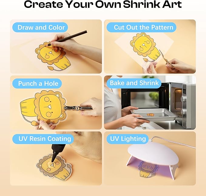- UV Resin & Lamp: Equipped with UV resin and a portable UV lamp, your finished shrink art will achieve a smooth, glossy, and durable coating. This not only enhances visual appeal but also ensures your creations last longer, giving your artwork a flawless, professional-grade seal
