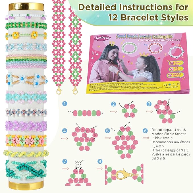 Funtopia Seed Beads for Bracelets, 4mm Uniform Glass Seed Beads for Jewelry Making, 39 Colors 3900pcs Small Tiny Bead Bracelet Making Kit with Tutorial for DIY Art Jewelry Making