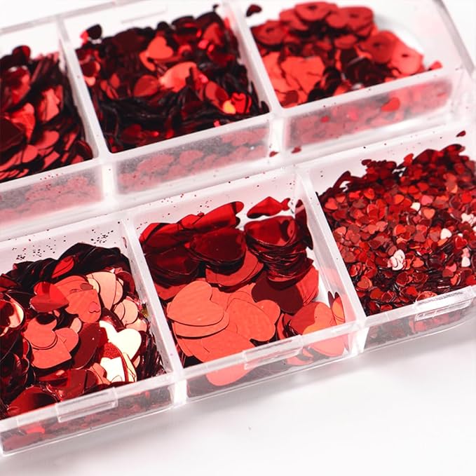 Valentines Holographic Nail Glitter Foils, 12Grid Red Sparkly Foil Nail Art Flakes Design, Laser Heart Nail Sequins Acrylic Supplies for Women Girls Manicure Charms Decor, DIY 3D Nail Art Tips
