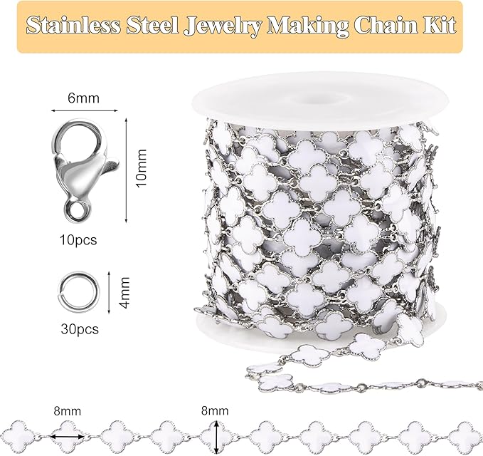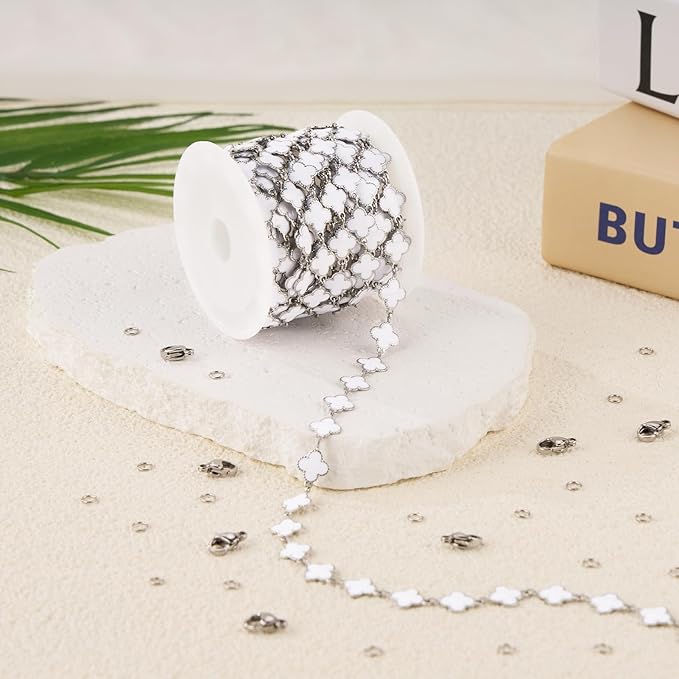Stainless Steel Chain for Jewelry Making 3 Meters 8mm White Enamel Clover Permanent Jewelry Chain Roll Bulk with Lobster Clasps Jump Rings
