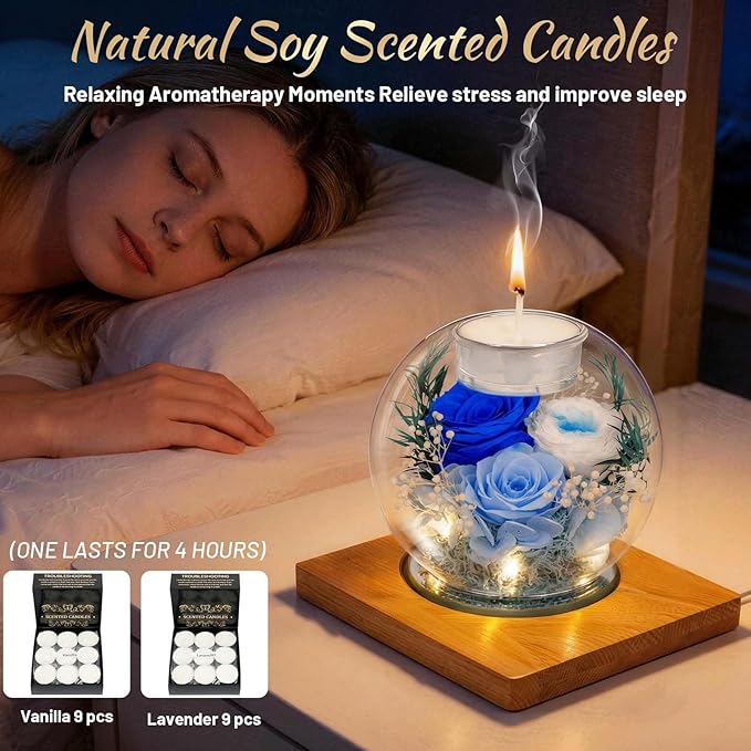 Preserved Blue Real Rose in Glass with Scented CandlesâEternal Flower Romantic Anniversary Mothers Day Christmas Birthday Valentines Day Gifts for Her, Women, Wife, Girlfriend, Mom, Grandma
