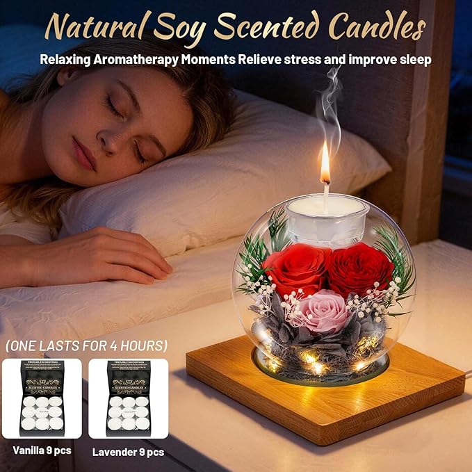 Preserved Red Real Rose in Glass with Scented CandlesâForever Flower Romantic Anniversary Mothers Day Christmas Birthday Valentines Day Gifts for Her, Women, Wife, Girlfriend, Mom, Grandma