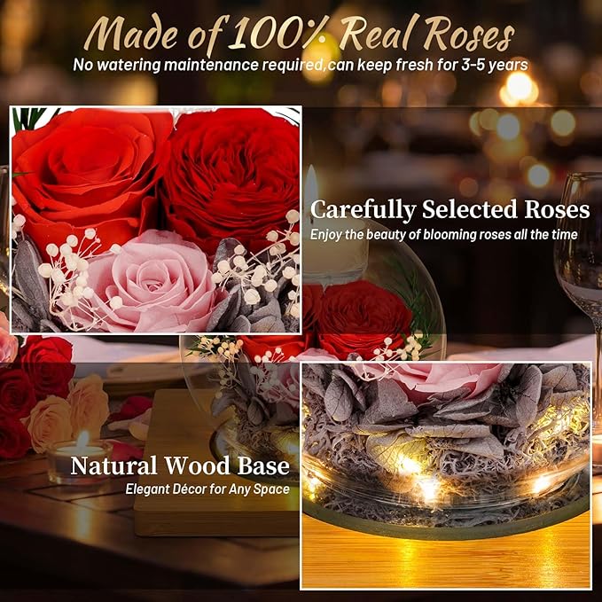 - đŽăElegant Home DĂŠcor with Emotional WarmthăThe preserved rose in glass adds refined elegance to any space, for home living room, bedroom, kitchen, bathroom, study, office, classroom, yoga studio, beauty salon, barber room and other scenes. Especially as a bedside lamp, it is also a good choice for those who have difficulty sleeping! It can help them relax and add a sense of ambiance. It enhances the atmosphere while subtly reminding her that she is loved and valued.