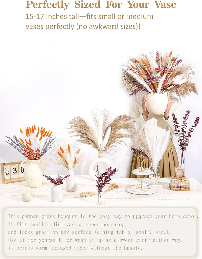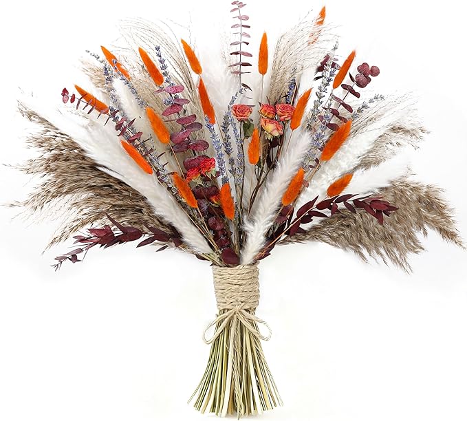 - Complete DIY Dried Flower Kit: Includes 20 stems of orange pampas grass, 20 stems of lavender, 8 orange bubble roses, 20 stems of pampas grass, 15 stems of white small reeds, 5 stems of five-jointed reeds, 1 stem of red narrow-leaf eucalyptus, and 3 stems of red eucalyptus; totaling 92 pieces of material to meet all your DIY needs