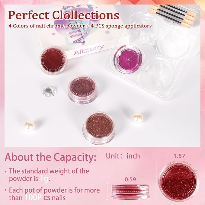 - Wide Usage: Allstarry pink red chrome nails powder has 4 colors(nail powder medium pink, red nail chrome, rose gold and purple chrome nail powder) which matches with valentines gel nail polish, purple nail polish, red nail polish, pink chrome nail polish, french manicure, 3D shell nails, meeting your needs for different works. The chrome powder for nails can be applied on UV gel nails, pink acrylic powder, natural nails or false red nails, nails pink. Also can be mixed into red gel nail polish and purple gel nail polish for its solvent resistance.